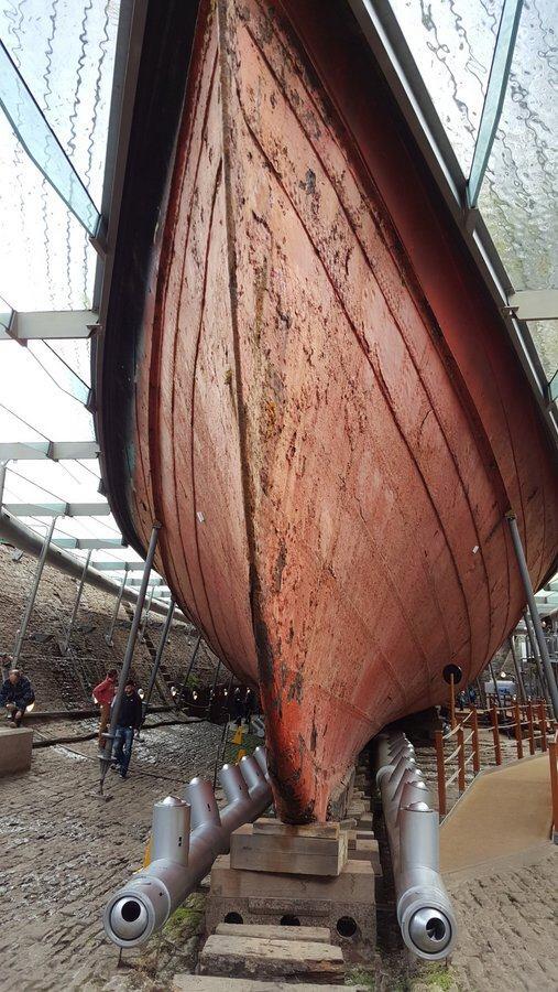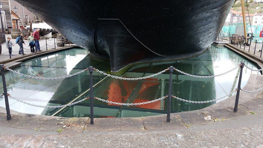 She also looks natural in her setting thanks to the glass floor at waterline level which holds a thin layer of water giving her the appearance of floating in her dock. (It’s not a unique trick. The Cutty Sark in Greenwich, London has something similar, but there’s no water and she is suspended rather un-naturally 3m above the dry dock.) The water, rippling in the breeze, not only makes her look natural in her dock, but also generates an aquarium-like atmosphere…