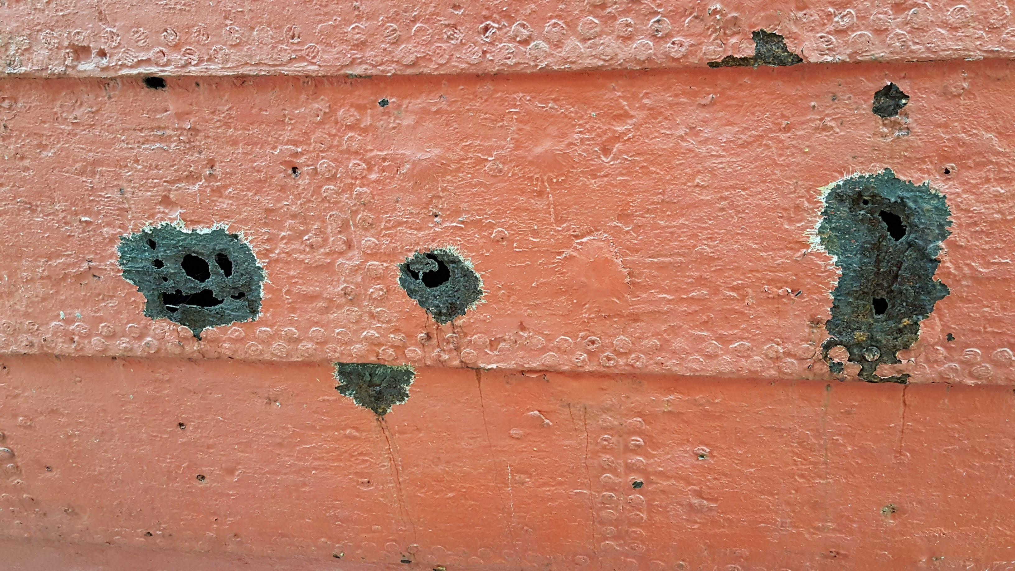 When you get under the waterline and up close to her hull, you begin to appreciate the colossal achievement in rescuing her from the Falklands and restoring her, because she is riddled with holes and rust. Actually the rust is being kept at bay by a controlled dry atmosphere in the sealed dock, maintained by an industrial-scale dehumidifier plant.