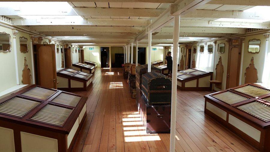 The route onto the ship is up through the adjacent museum building which houses many large components from the ship (like parts of the original rudder), artifacts, and documents (tickets, posters, journals, etc), laid out in. There’s lots of interactive stuff for kids and adults, and a section devoted to the rescue of the derelict ship from the Falklands.
