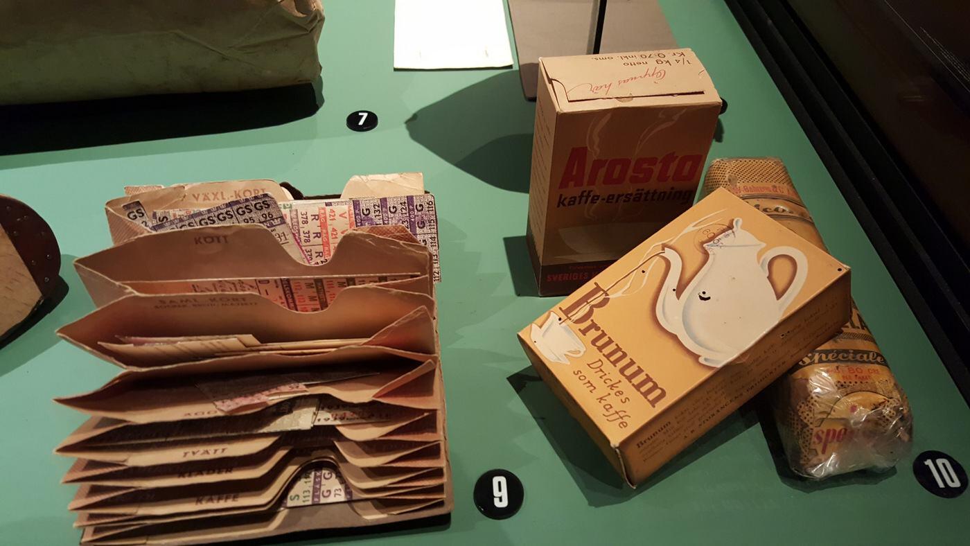 There are some very interesting photographs documenting the war years in Sweden, including one striking image taken on the Swedish-Norwegian border with a Swedish border guards and German soldiers posing for the camera. And to give some idea of the hardships that came with neutrality, domestic items such as ration cards and artificial coffee.