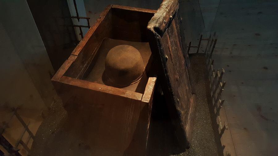 There is a display of clothes worn by typical seamen of the period and the contents of a wooden locker, previously un-opened since the owner placed his large brown hat on the top of the shoes & gloves already inside.