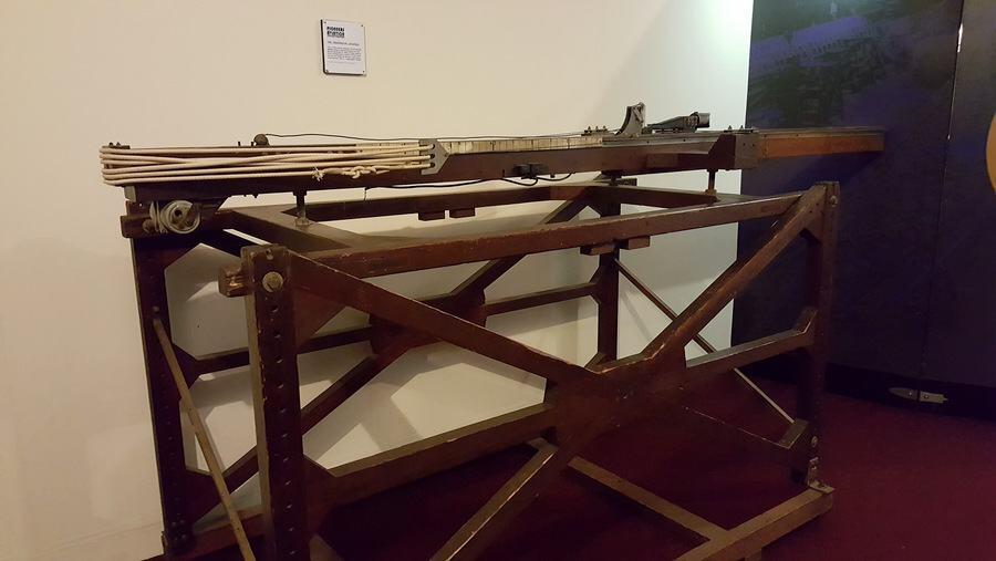 What really fascinated me was not just the replica ‘bouncing bomb’, nor the photographs of the Top Secret mission orders for the 617 Squadron raid on the dams, nor the recreation of his office with models of his inventions to come, but rather, the creaky wooden frame with elastic ropes – the actual catapult device he used for skimming test models of his ‘bouncing bomb’ along the research water tank at the National Physics Laboratory, Teddington.