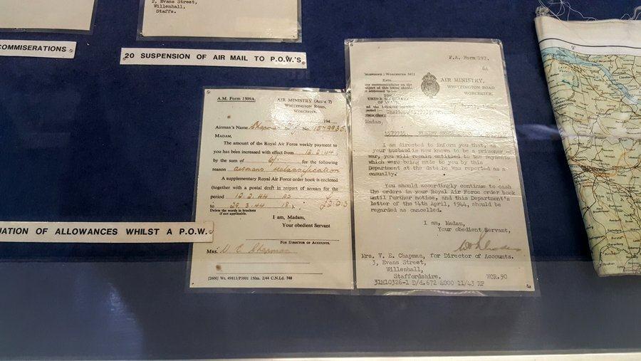 All the while as you work through the display cases you don’t know what happened to him, but then, relief! Notification that he is alive and a Prisoner of War (POW), then desultory correspondence via the Red Cross, and a letter confirming the change in RAF allowance now that his status has changed! Nothing stops the clerks!
