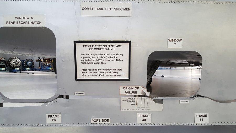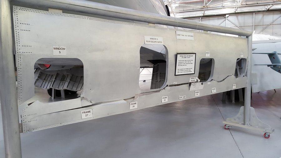 Here’s where those engineering students come to look at the collection of aero engines – primitive, complex and game-changing; to admire (or not) James May’s lifesize Airfix Spitfire glued together in a TV programme by a team of Air Cadets with himself modelled as the pilot (as I recall they had a lot of problems stopping the heavy wings from drooping); and to look at the failed hull section from the famous Comet 1 (G-ALYU) pressurisation stress tests that were a landmark in Air Accident Investigation techniques.