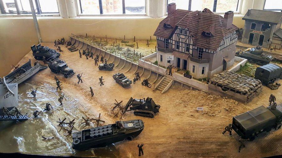 A walk through the galleries doesn’t start in 1748 though. It starts with a model diorama of the beachfront on Juno Beach at Bernières-sur-Mer where the Royal Berkshires came ashore and directed operations. I love a good model, and this is a good model! On the wall above it; the actual name sign of Bernières Cafe that features in the model. Most military museums feature a fair amount of “liberated” memorabilia and this museum is no different.