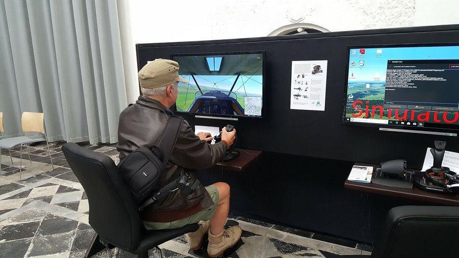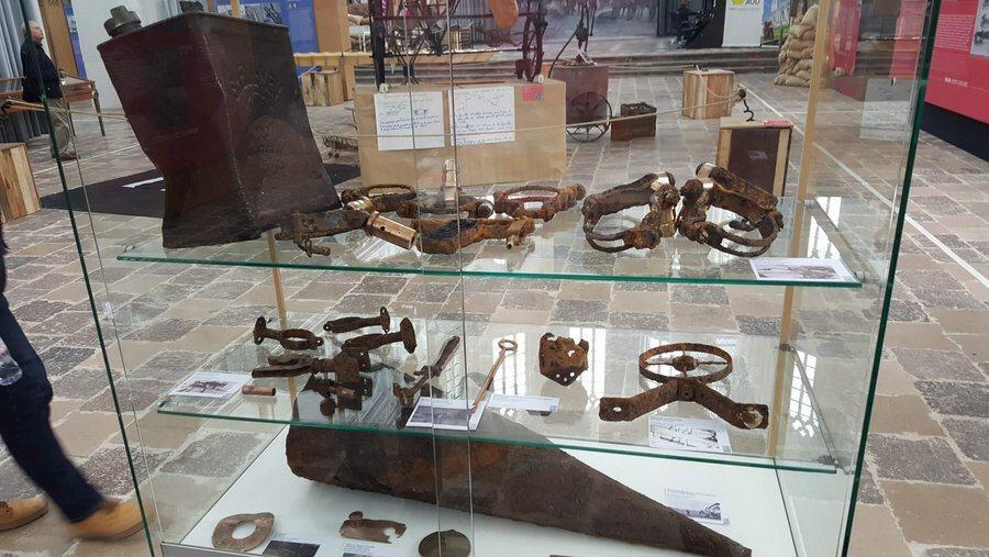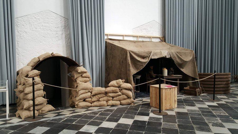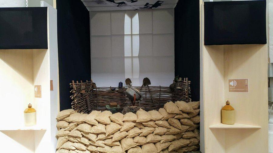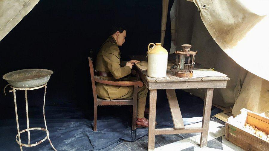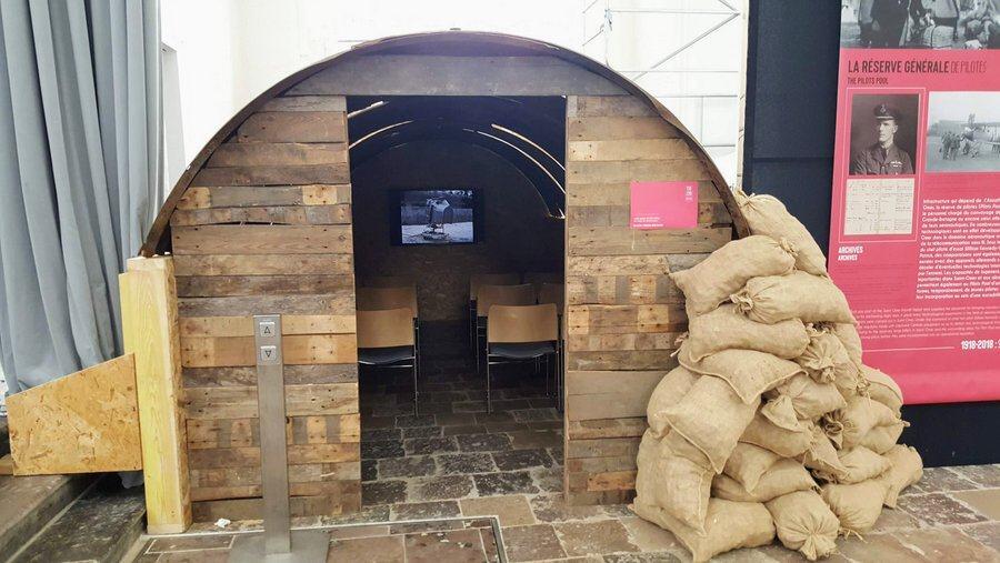 The exhibition also makes clever use of technology to explain the history of the RFC/RAF. You can listen to audio of pilots (actors) and other personnel talking about their experiences by clicking the red button on top of the ceramic drinks flagons dotted around, watch cine footage (inside a squadron briefing room), use interactive maps to see aerial photos of airfields around St. Omer and compare with today’s landscape, and try your hand at flying a British, French or German aircraft in the skies above St. Omer on one of four flight simulators designed by graduates of Kingston University Aerospace Engineering.