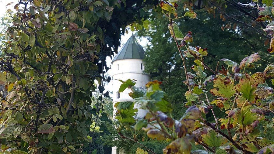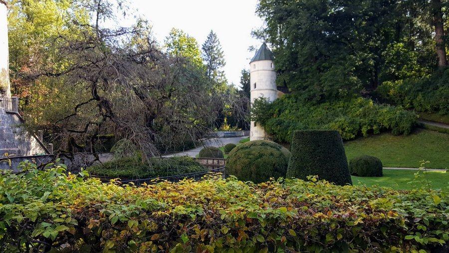 Outside the castle the gardens and views are worth seeing. The formal gardens are elegant and have a fairytale feel to them with a ‘Rapunzelesque’ tower. To the right of the tower there is a small cliff face with caves that were allegedly used for all kinds of wild parties, and past the tower the path crosses a high wooden bridge over a steep ravine before entering the woods.