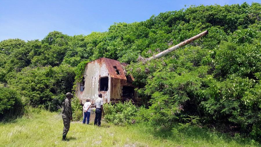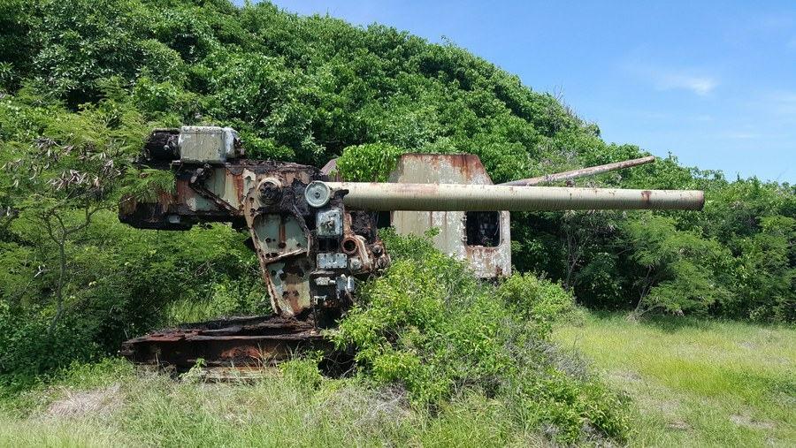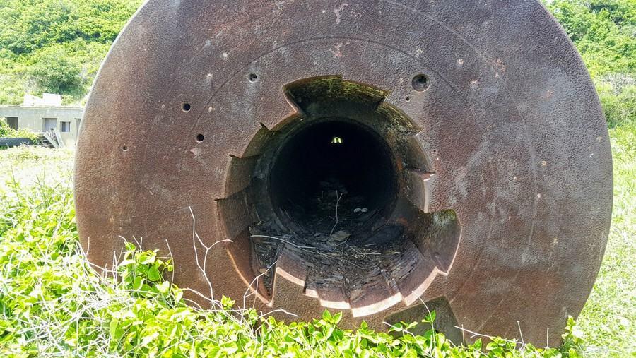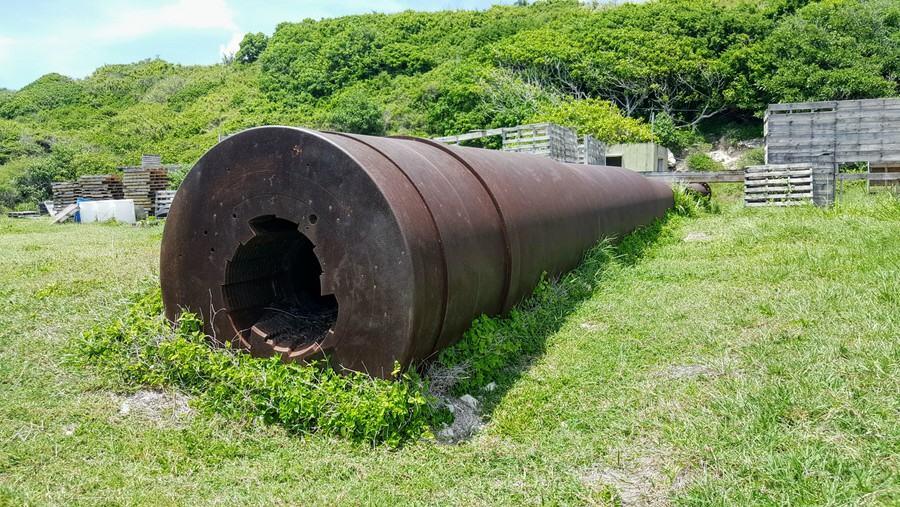 This first HARP gun was clearly visible in 2014 but has been decaying with rust quickly and is now all but lost in the bushes at the site. Its successor is very much visible though, as are other parts of the project. There were small HARP project 5″ & 7″ naval guns which were used to test explosive efficiency, sabot design, muzzle velocity and other way of getting the sabot rounds to max range. There’s also, lying on the ground, a long section of a large bore barrel which hadn’t yet been used.