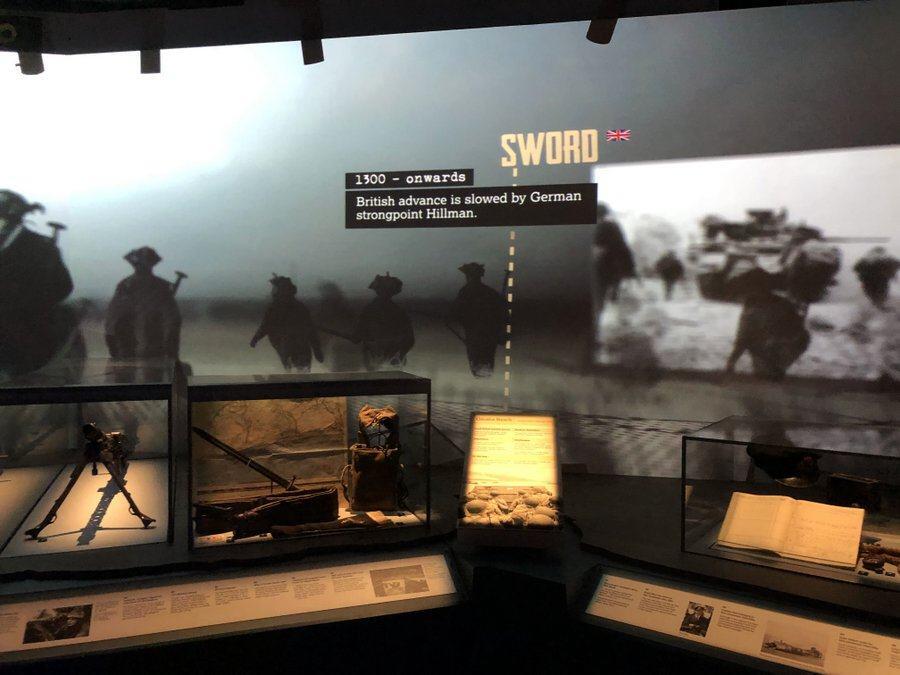 Moving into the D-Day and Battle of Normandy section, we hear the thoughts of troops on board a landing craft, before a spectacular audio-visual section projects archive film of the landings onto a wall map of the beaches.