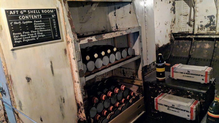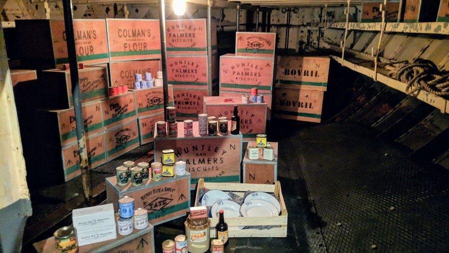 Stairs or a lift (The access ramp and lift were installed to allow all visitors, including those using wheelchairs could access the ship.) take you to the bottom of the dock and you enter onto her lower decks through a door cut in her hull. She is pretty clear down below, with some displays recreating her stores and munitions magazine.