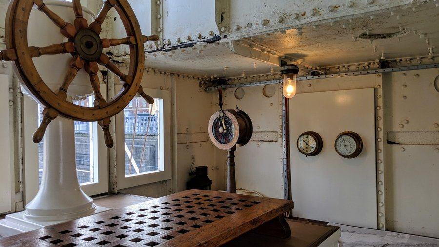 The odd thing about the wheelhouse is that wheel itself and engine room telegraph are mounted on a high plinth, whereas the chart table is at deck level. I’m guessing this was to improve the view from the steering position, so the helmsman could see better over the forward gun (unusually at that moment there was nobody around to ask).