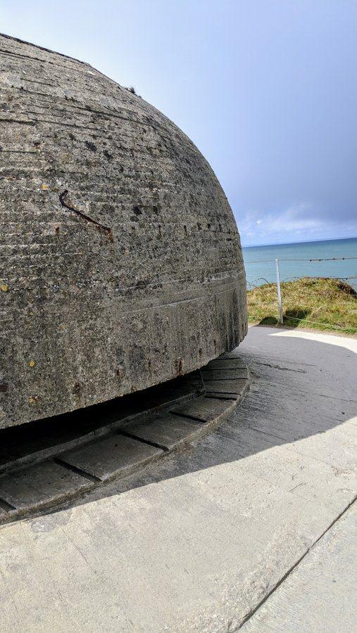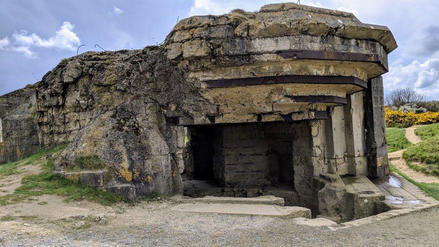 Well, astonishingly, 75 years later, the whole site is little changed from 8th June. The guns aren’t there, but then, they never were! But the casements and gun pits are – some heavily damaged. The observation bunker on the cliff edge is still intact. You can wander into it, and peer out of the slit and read the remembrance plaque to the Rangers inside.