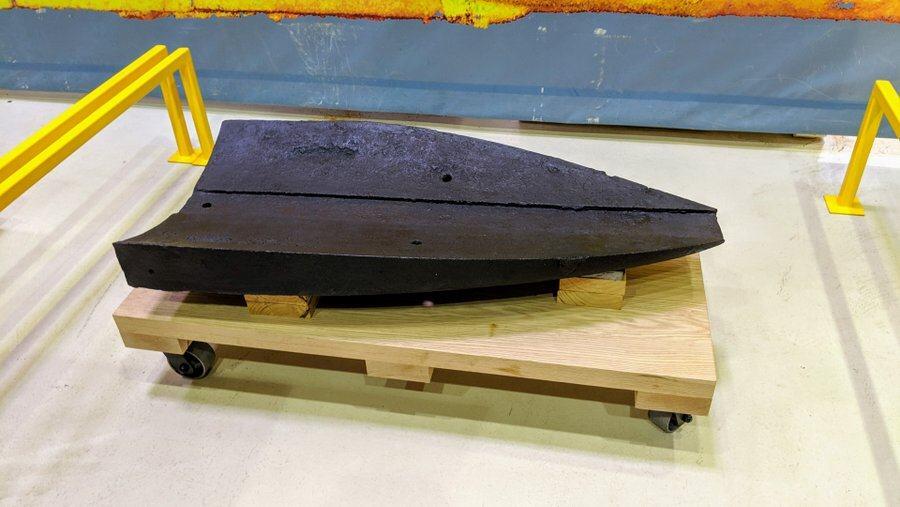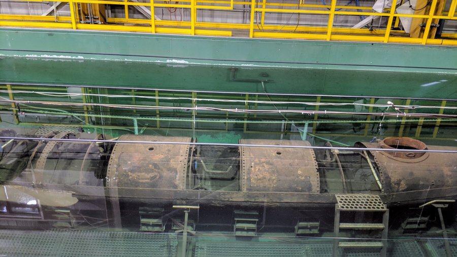 I was lucky to visit in a small group private tour which I organised with the director, Kellen Correia, but the format is standard. You are free to wander around the museum displays at your own pace, then visitors are guided into the lab end of the building where the Hunley sits in her tank, behind a glass wall. The glass is as much for our protection as the Hunley‘s. For the first dozen or so years she was kept under water, which was drained regularly to allow work on her, but for the last five years she has been bathing in a solution of sodium peroxide – nasty toxic stuff!