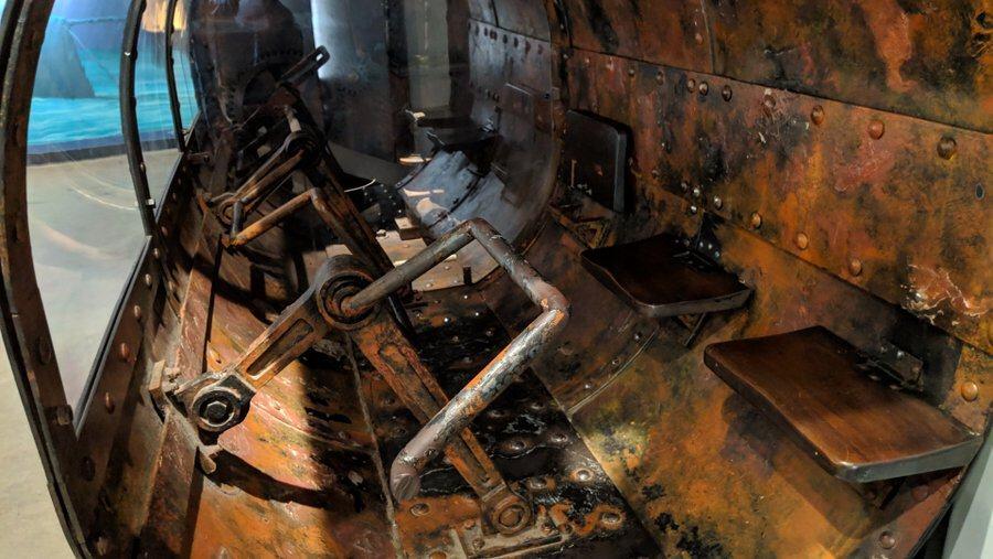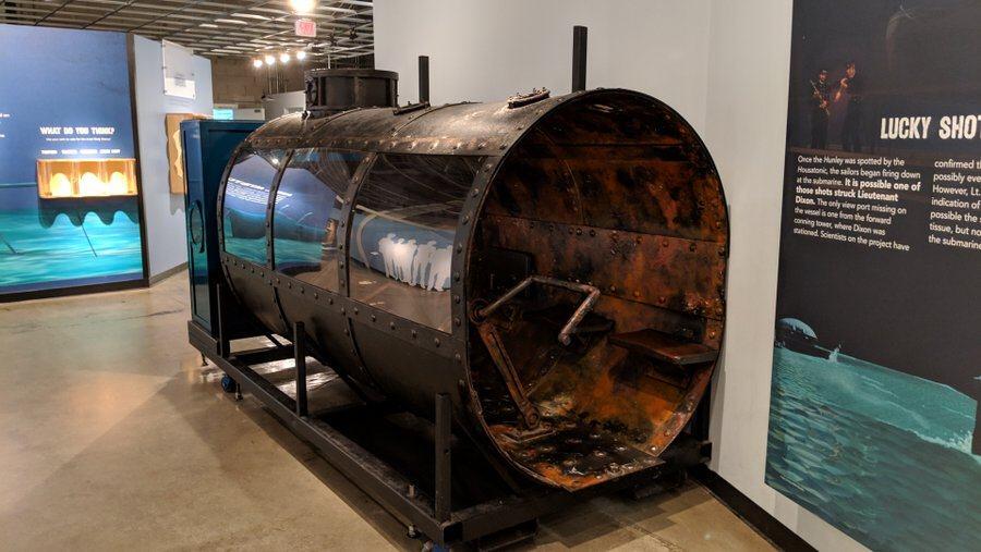 - A mock-up of the Hunley interior that allows you to sit in the crew positions and turn the hand crank that drove the propeller. It feels cramped and gives some idea of what it might have been like for the crew.