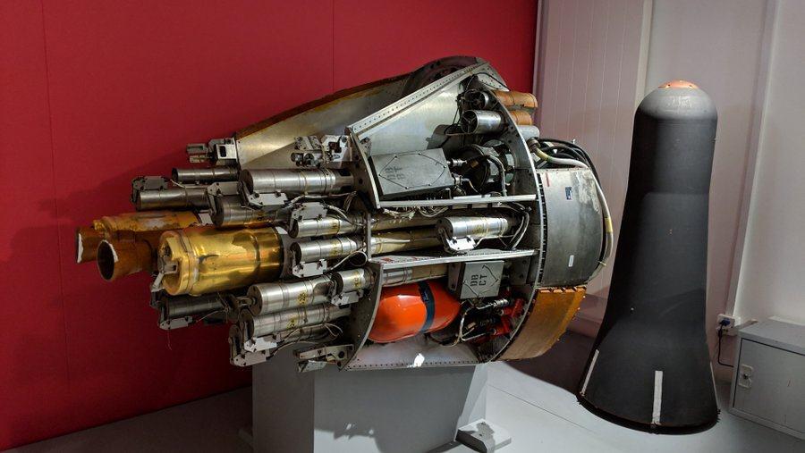 This is the head of a Polaris Chevaline missile. The outer nose cone is really there to protect it as it rushes through the water on launch. It is discarded when it gets up to a high altitude. Then the whole thing starts separating.That black space capsule on the right is one of the A3 200-kiloton warheads. It sits in the slot on the top of the package (where the yellowish rust/grease streak is). It and its siblings are designed to re-enter the earth’s atmosphere. Meanwhile, as they start re-entering, all those tubes are various kinds of decoys and they start popping out along the same track as the warheads. Some of them deploy chaff, others are designed to look like warheads to anti-ballistic missile radar, and others just create multiple moving targets. All terrifyingly clever stuff… and this is old technology.