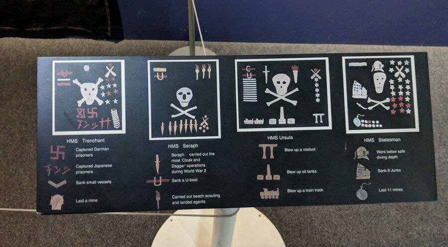 - Jolly Rogers RN submarines began displaying their war record on home-made Jolly Roger flags on their return from operations. The museum has a set of four, from HMS Trenchant (top left), HMS Ursula (top right), HMS Seraph (bottom left), and HMS Statesman (bottom right). The symbols denote a particular achievement. So a ‘U’ with a red line through means they sank a U-boat. I think the diver’s helmet on HMS Statesman’s flag is a little worrying. It means they dived below their safe depth!