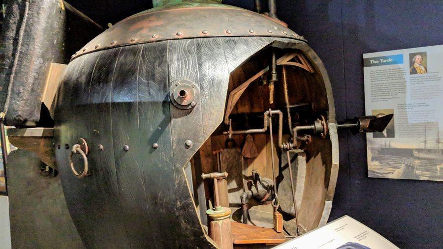 From here there’s the entrance into the main museum galleries, which run pretty much chronologically, starting with a model of the world’s first submarine, The Turtle, and ending back on the ground floor with contemporary nuclear subs.