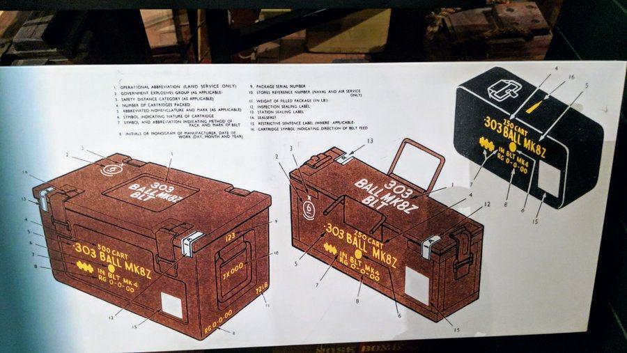 After the Sea Mine Gallery on the logical route through the museum comes a gallery with several themes and miscellaneous items, such as a five-barrelled Hotchkiss 37mm machine gun from 1889. One section focuses on packaging. Why not? As an armaments factory and depot, the munitions Priddy’s Hard supplied had to be packaged up in wooden or metal boxes & crates. There’s a stack of ammunition boxes, many with their ‘P.Hd’ mark on them, and displays explaining the markings.