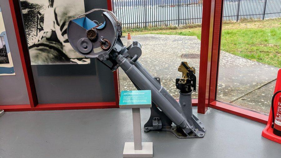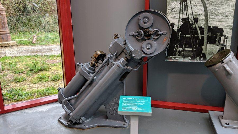 In a glass enclosed passageway between halls there is a small collection of anti-submarine depth-charges and mortars. These are historic weapons that you don’t see often. Depth charge throwers and the forward firing Hedgehog mortars were the primary weapons that brought destruction and defeat to the U-boats during the battle of the Atlantic in WW2, as did the Squid 12″ mortar in the closing stage of the war.