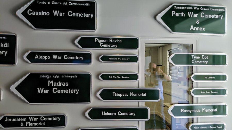 The CWGC is fastidious about every detail of their signage in stone, wood, on metal, and even their directional signs². The colour, the font, the spacing… all aspects are detailed, specific and uniform throughout the world, and you get a sense of that when you see their sign-writer in his workshop surrounded by examples of his work.