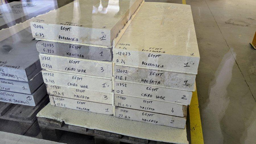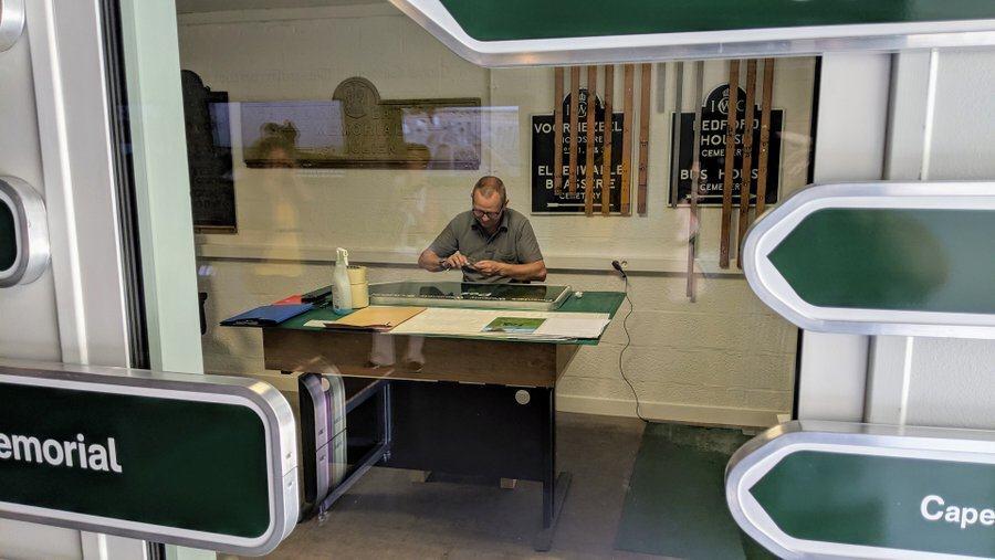 The CWGC have a standard for the legibility of headstones – you have to be able to read it from 2 metres away. In one room they have a set of four headstones in declining stages of wear so that you can judge which should be due for re-engraving. Gareth Hardware is clearly proud that they couldn’t find an example of a badly worn headstone in their cemeteries to be the worst example, so they had to shot-blast one to make it look worn!