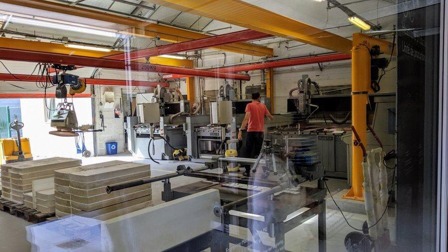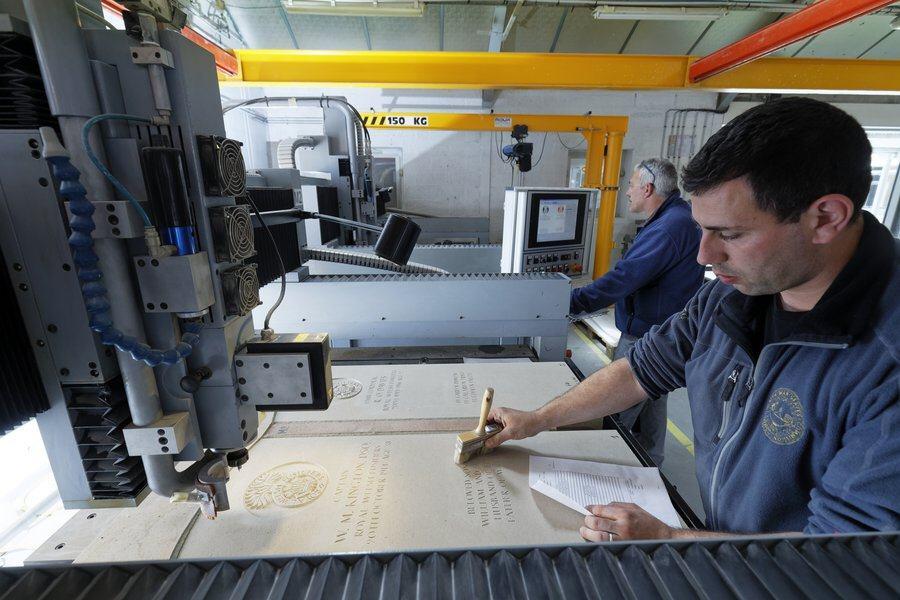 The first workshop is the stonemasons’ cutting and engraving workshop. I must admit I’d never really thought too much about what is engraved on headstones and how they do it. In the workshop they handle, cut and engrave new headstones weighing around 80 kilos each on computer automated benches. They have the capacity to produce & engrave between 20 – 22,000 headstones a year, but they have a new conservation-oriented policy now, which means they actually produce around 3,500 – 4,000 new headstones a year here in the workshop and re-engrave headstones that need it, in situ.