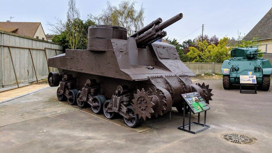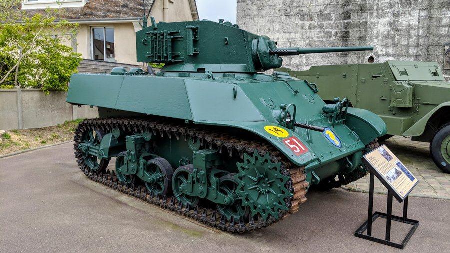 There’s a well restored M3 Stuart light tank. The M3 was an American made tank, used in this example by the British Army as a scout. This version was adapted for beach landings in up to 1 metre of water. The hull was waterproofed and the air intake & exhaust mounted high up. A few days after landing on 6th June, this one was also equipped with a hedge cutter to make getting through the Normandy bocage (thick hedgerows) easier.