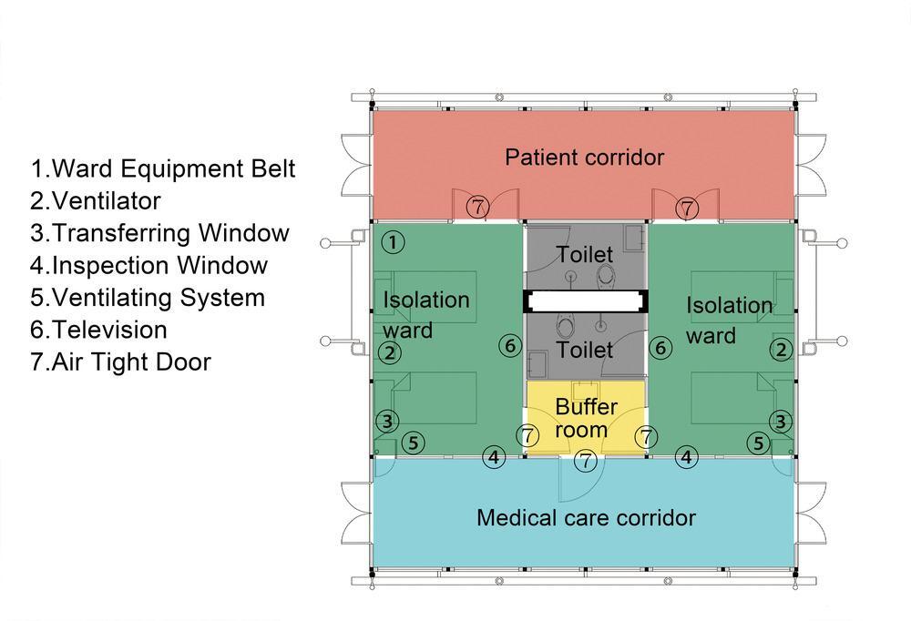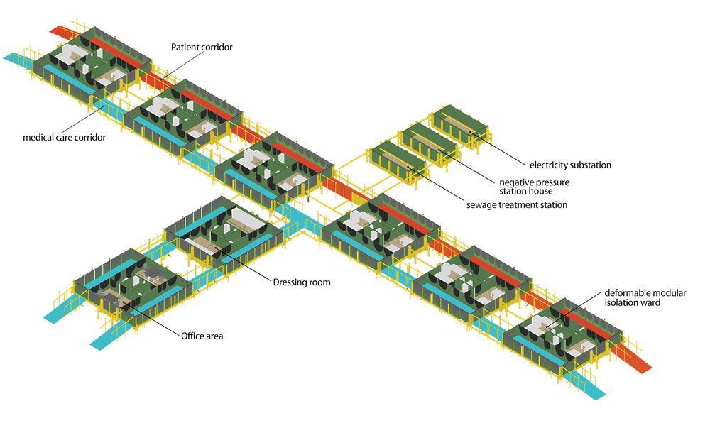 The modular hospital is designed by Professor Chenping Han and his team from School of Architecture and Design, China University of Mining and Technology (CUMT). The project consists of the isolation ward area (24 beds), the medical staff work area, and auxiliary functional areas for power, water, ventilation, and oxygen supply. The project core is the isolation negative pressure ward. The treatment, office, cleaning, ventilation, and energy units are auxiliary modules.