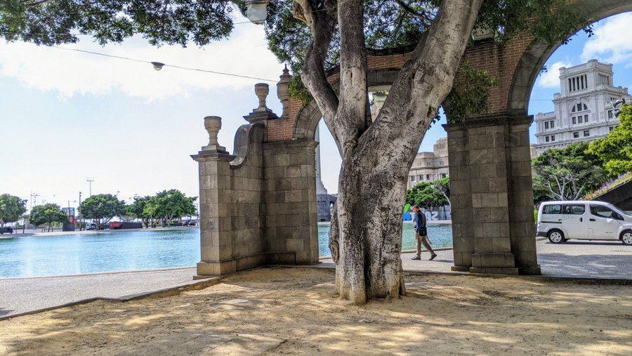 Here! Just about where those workmen and their truck are, in the Plaza de España. We know his boat was coming ashore just to the northeast of San Cristóbal castle opposite the Alameda gardens, and fortunately the arches of the Alameda gardens still survive, so it’s easy to triangulate the spot!