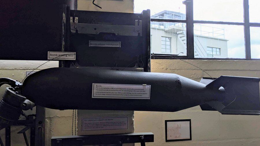 “And what happened if he wanted to go to the toilet?” That got their attention.Next to the control tower, the original night-flying equipment store has been extended and houses a number of interesting items. There are some photographic displays and accounts of Bloody 100th missions, like the Münster Raid on 10 Oct 1943. Most of the items in here focus on engineering and armaments. It gave me a chance to study the way different bomb loads were rigged in the bomb bays and how they were attached via their bomb shackles to the bomb racks.