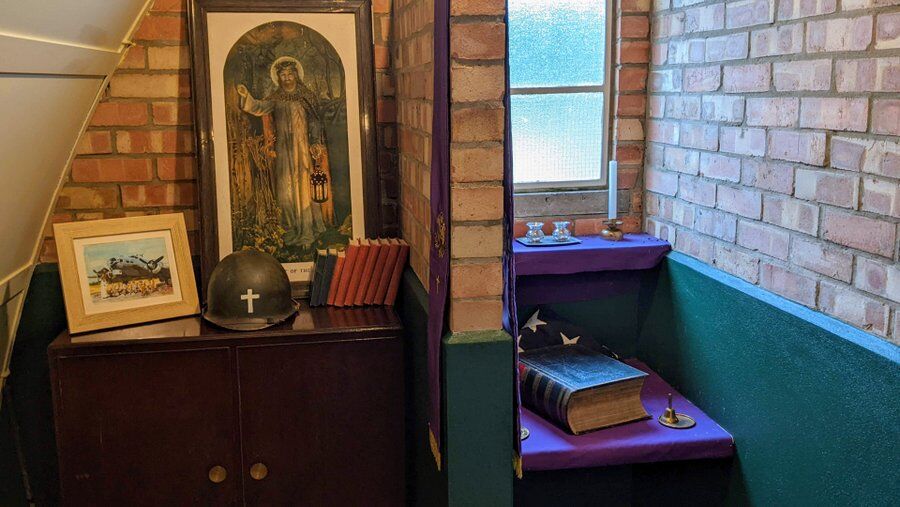 The building has three rooms: a briefing room where there is a short film about the 95th BG and some details on the walls; a recreation of the Chaplain’s room (Capt Father J. Hinkley); and a recreation of a Commanding Officer’s office (David McKnight).