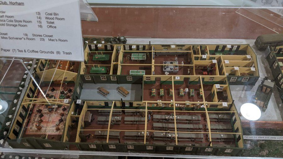 The former Red Feather Club kitchen is now the main entrance to the museum and the café. Its main feature is a large model map of the airbase, which shows just how extensive this enormous base was ****. Around the walls of the room are display cases with bits of aircraft and other airfield exhibits. The kitchen leads into…