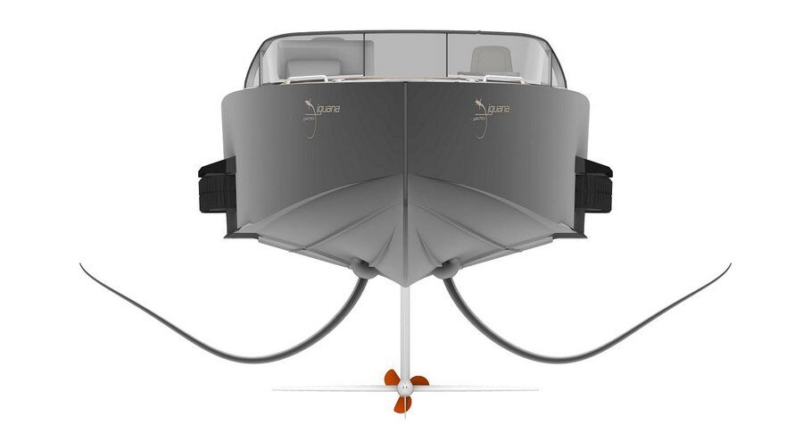 The Iguana foils are designed to make the boat simple and stable. Foils reduce the drag and the energy consumption by 50%. The surface piercing foils are auto stable when foiling. The foils can be folded for manoeuvres in harbours as well as when foils cannot be used in harsh seas. When the foils are folded, the boat works as a normal semi-planing hull.