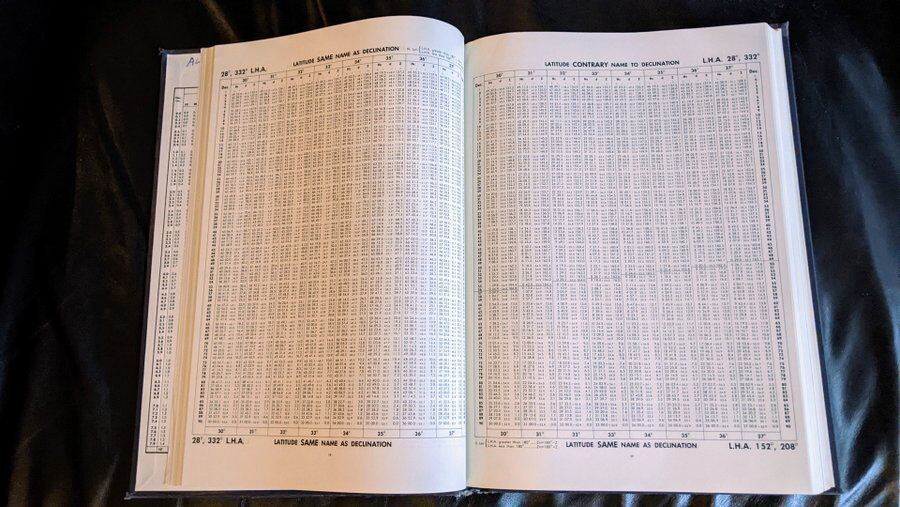 Now, armed with a sight and the time it was taken, it’s time to plot a position line on your paper chart. But, with calculators banned, there are no shortcuts here either. Guy, and most other competitors carry an Almanac and four hefty volumes of Sight Reduction Tables for the Latitudes 0°-15°, 15°-30°, 30°-45° & 45°-60° covering their route.