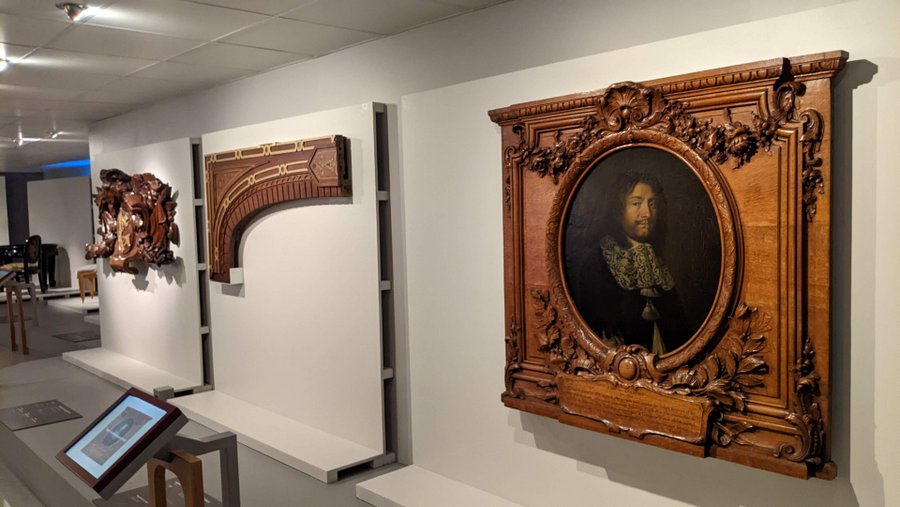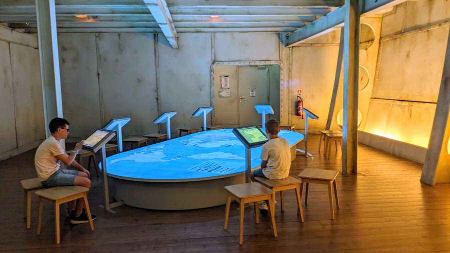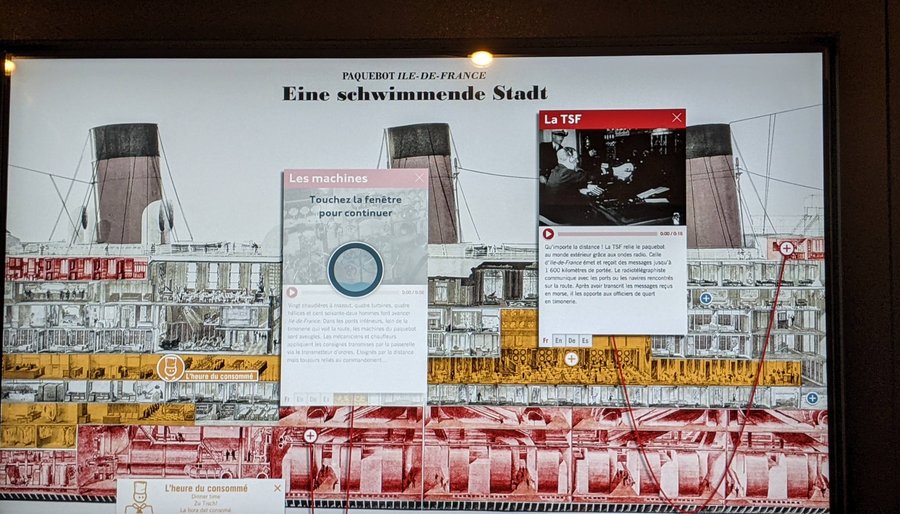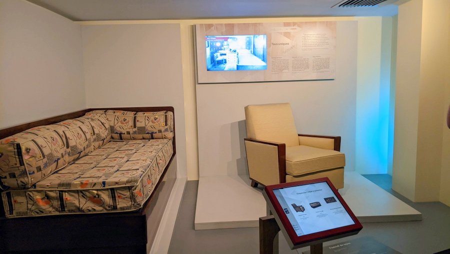 Up on the bridge there is theatre style seating so visitors can take the weight off their feet while the guide explains the intricacies of navigation. Then there’s a sort of mini museum with interactive digital displays explaining the inner workings of the SS Ile-de-France (1927). You can press on any part of the ship to find out more about it and the people who worked there. The museum also has some more rare pieces of furniture and decorations saved from the famous ships.