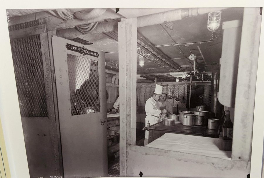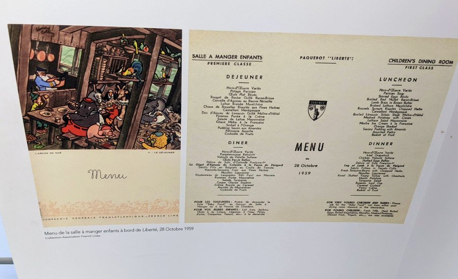 This ‘Dining Room’ has displays of elegant crockery and cutlery used on some of the ships, and the mouth-watering menus. Some menus were quite specialist. There was a big demand for kosher meals (all prepared in a dedicated kitchen), and kids’ menus – in the case of the 1st class children, served in a dedicated room. The walls of children’s dining room on the SS Normandie were decorated with images of the cartoon elephant, Babar, painted by the artist herself.