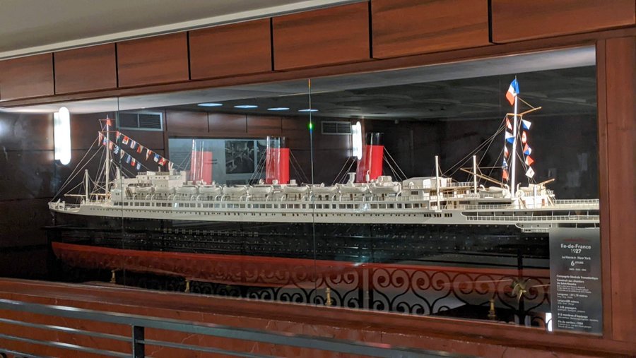 The museum is on the balcony level of the Grand Entrance Foyer (with a rather impressive model of the Ile-de-France) and the tour route brings you out over the bar, looking down at the ‘Dining Room’.