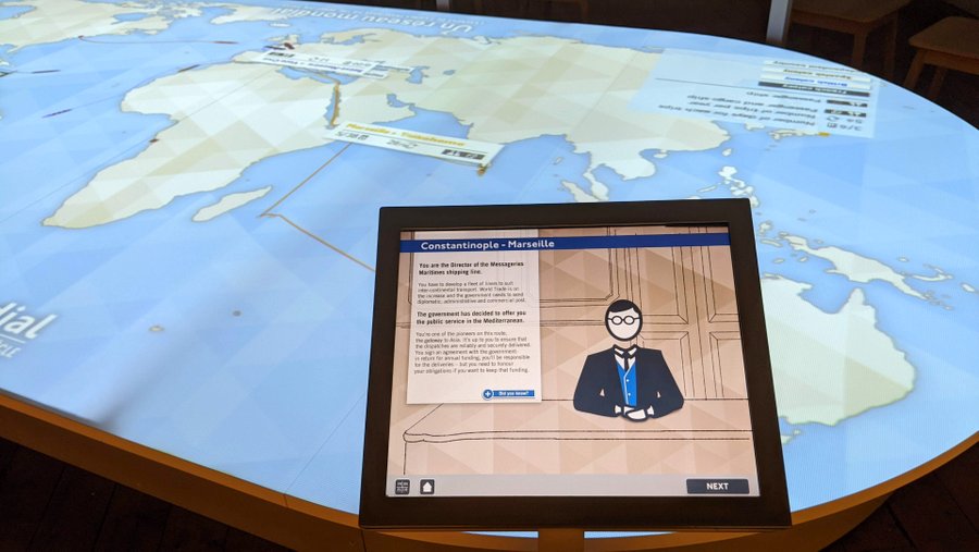In this section of the ship – down in the hold – there’s an interesting digital simulation. You can play the role of a ship-owner around 1900 who has signed a contract to run mailships on a selection of routes. I took on the Messageries Maritimes Company, operating my first ship on the Constantinople to Marseilles route.