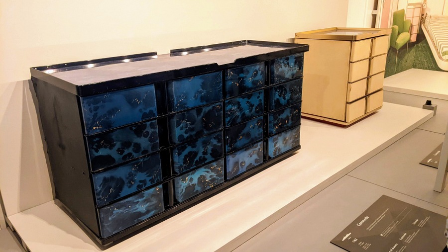The tour path takes you along corridors and past examples of First & Second class cabins with their furniture and decorations. The specially commissioned furniture in First Class could be both elegant and practical, such as the blue lacquered multi-drawer sideboard on board SS France (1962) and the smaller brown one on board SS Liberte (1950) – note both have ‘fiddles’, raised surrounds to stop items rolling off in a heavy sea.