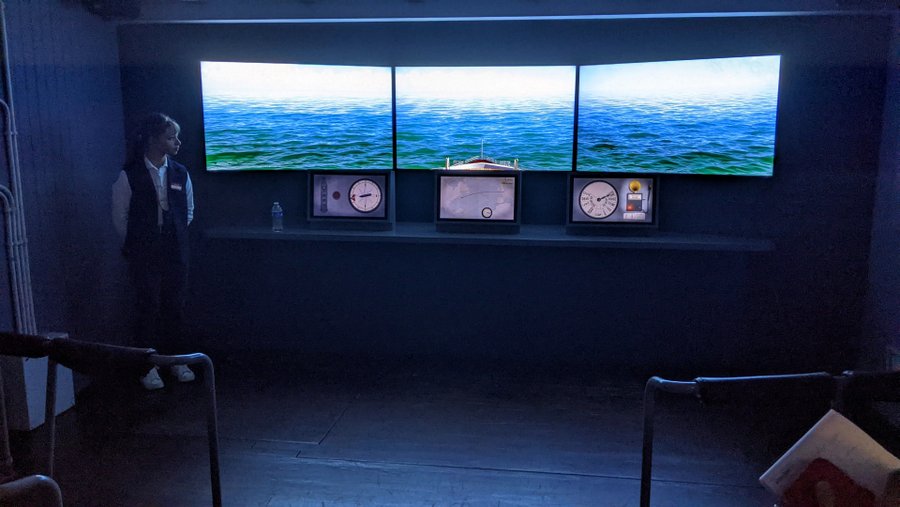 I think the promenade areas are the best parts of the ‘ship’. They’ve made good use of the huge submarine pen to recreate the views over water, from the stern rail, the enclosed promenade deck, and the open promenade deck. And there are things to look at – wildlife, passing ships, passing icebergs – all the time.