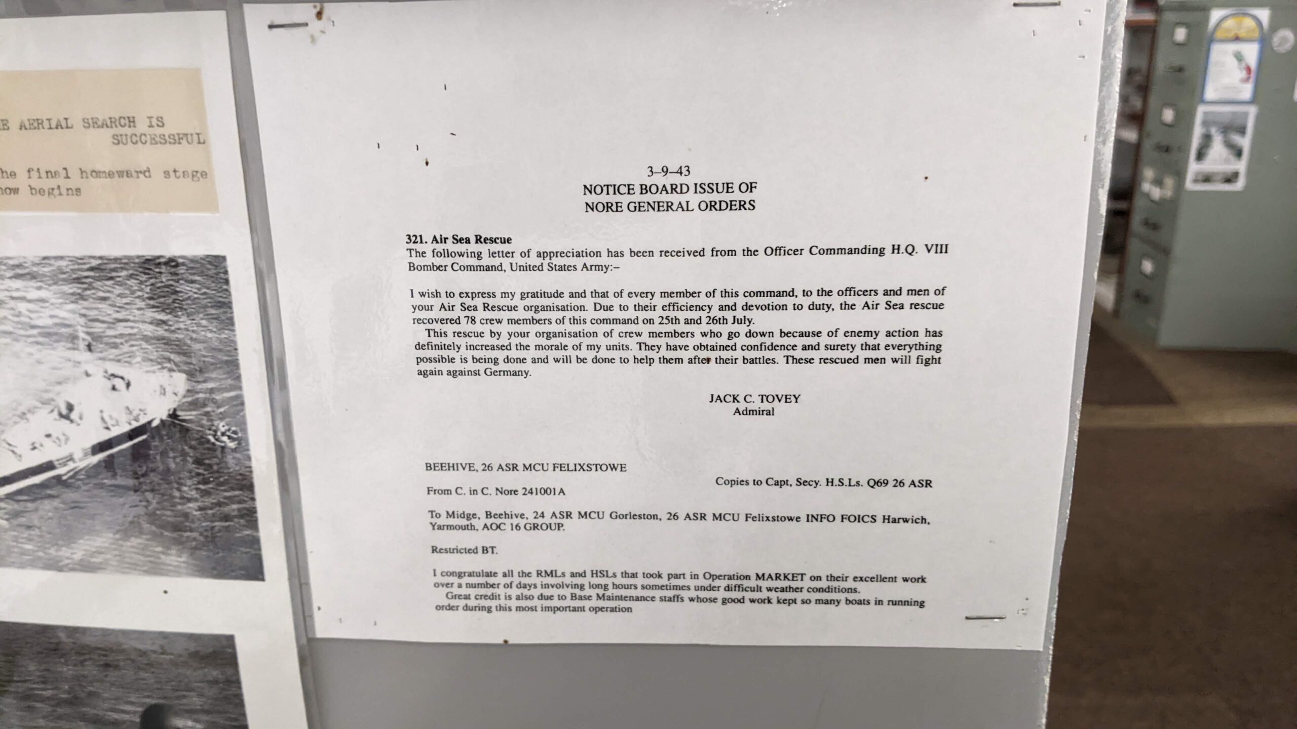 This Portakabin is focused on the work of the Air-Sea Rescue units from WW2 into the Cold War era. The displays are mostly models, photographs, and documents, including a letter of appreciation from the USAAF 8th Air Force congratulating the RAF Air-Sea Rescue services for saving 78 aircrew over 2 days.