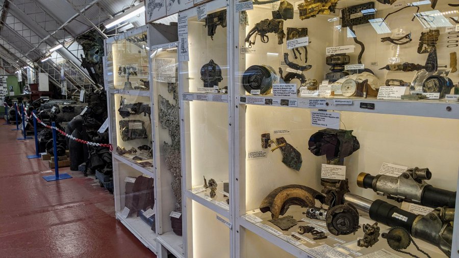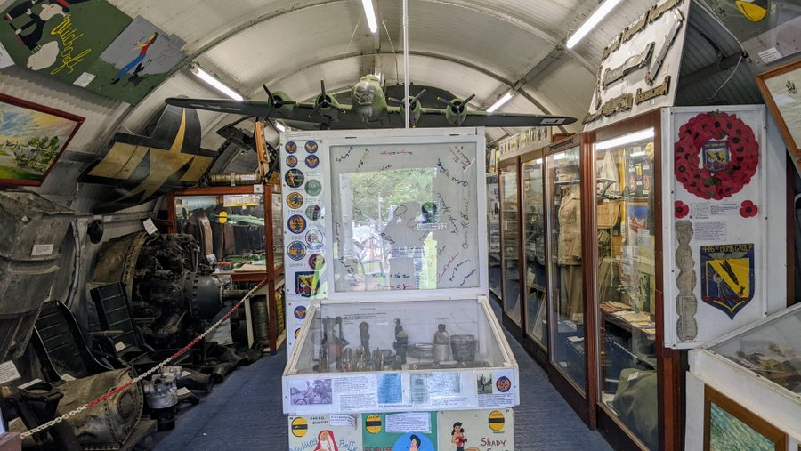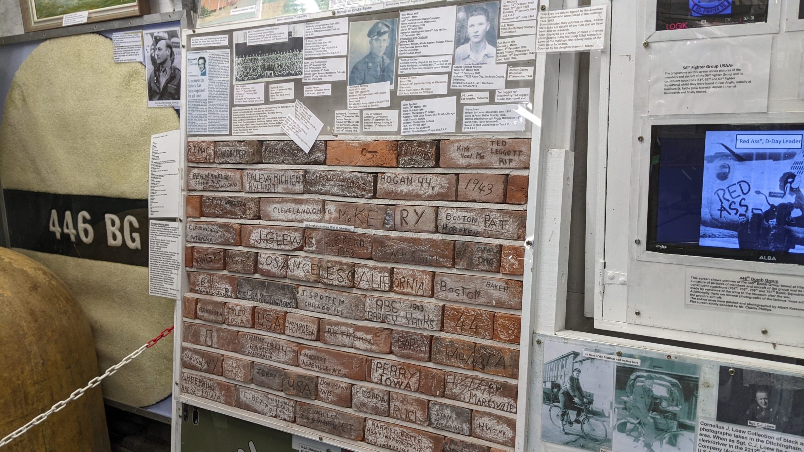 The Nissen hut has aircraft components, instruments and equipment, uniforms, and personal items. There’s also a section of wall taken from a building on the site with the bricks signed by US personnel on the base.