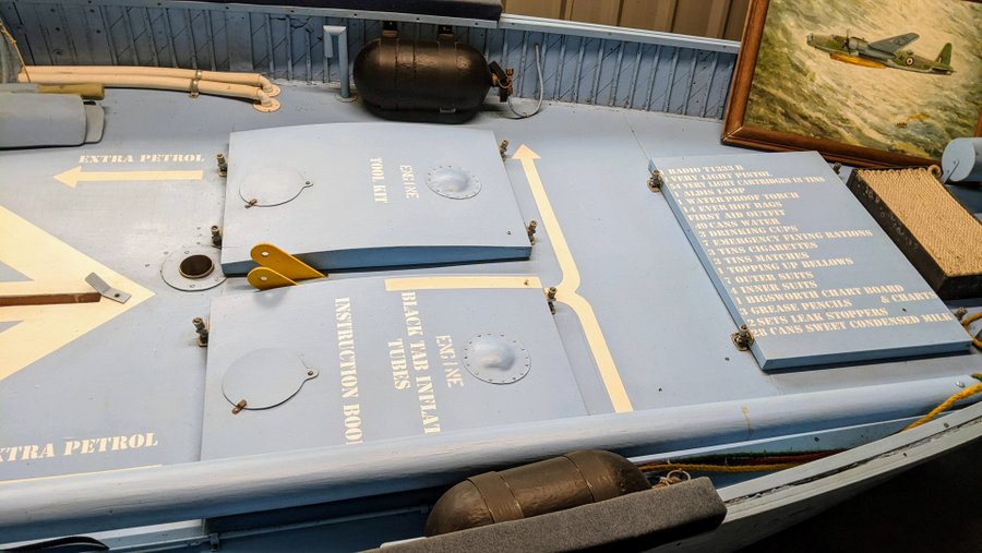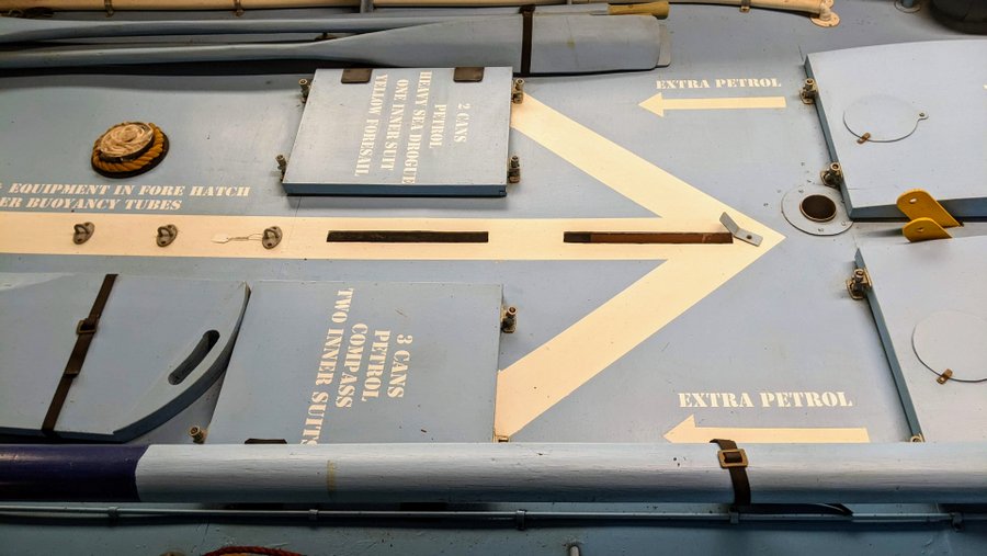 See that black rod sticking up with a yellow handle/grip? When I saw it I thought it was a ‘whale’ pump, for pumping out water. It was only weeks later when I was looking at a diagram in the ‘Rescue from the Skies’ book, I suddenly realised… it’s one of the rockets! When the lifeboat landed in the water it immediately fired a rocket at the bow to deploy a canvas sea anchor so it wouldn’t drift away AND it fired two rockets each carrying a buoyant line some 200 ft (61m) out to the sides, so that the airmen could grab one and haul themselves to the boat. That’s pretty clever!