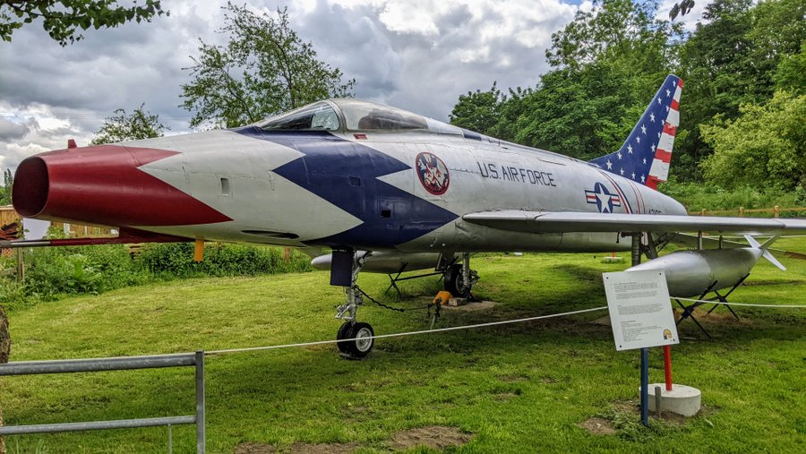 On the other side of the driveway is the F-100 Super Sabre from the same era but a little faster. It could clock 864 mph (just over Mach 1) This one, an F-100D fighter/bomber variant, was loaned to the museum by the USAF in 1978. It is painted in the colours of the US Skyblazers aerobatic display team.