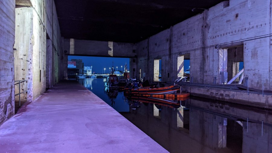 After WW2 the base was occasionally used by the French Navy and commercial maritime companies, but it was mostly left derelict till 1994 when the city council decided to make better use of it. Project ‘Ville-Port’ opened up the back wall to pens 8-11, and used the pens for an experiential museum, exhibition space, and a music venue. They also built a long ramp up to give the public access to the roof.