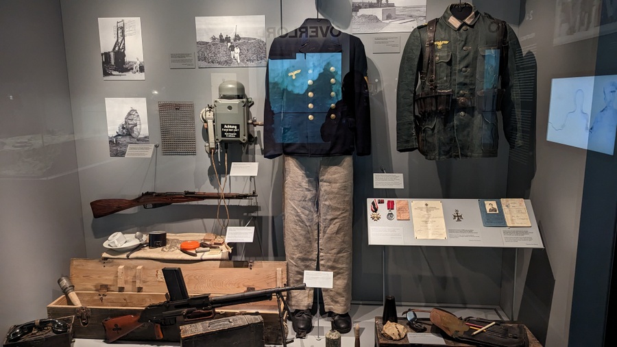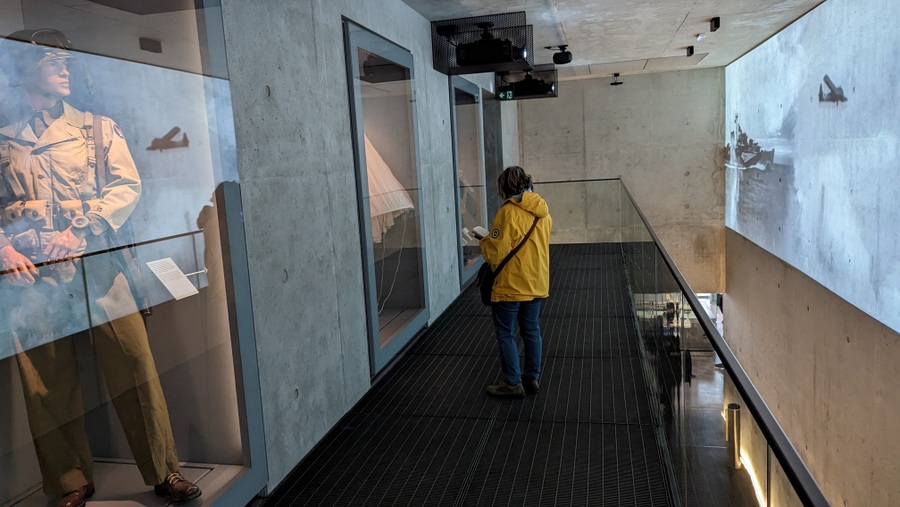 The next large space covers the landings. A 7-minute archive film explains how the landings (Operation Neptune) on the 5 beaches were achieved. The display cases around the walls have uniforms and equipment.