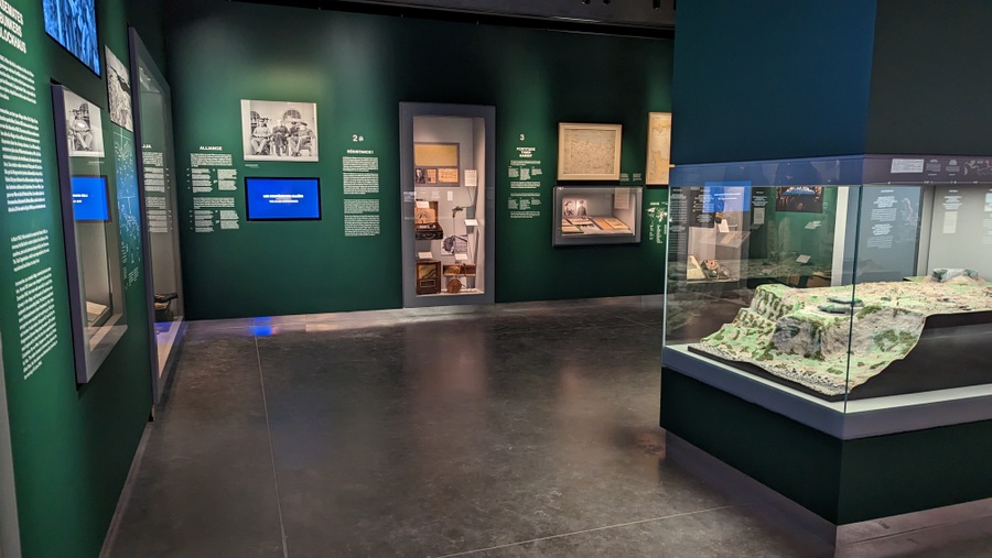 The first spaces focus on Arromanches under German occupation before the invasion, and on the role of the Resistance in gathering and supplying information to the Allies. It also highlights, with photographs and documents, the beginning of the invasion planning when Churchill, Roosevelt and Stalin started the ball rolling. There are display cabinets with German & Allied uniforms and equipment that lead through a corridor where the events of the night 6/7 June – parachute drops and bombing – are projected on the wall.