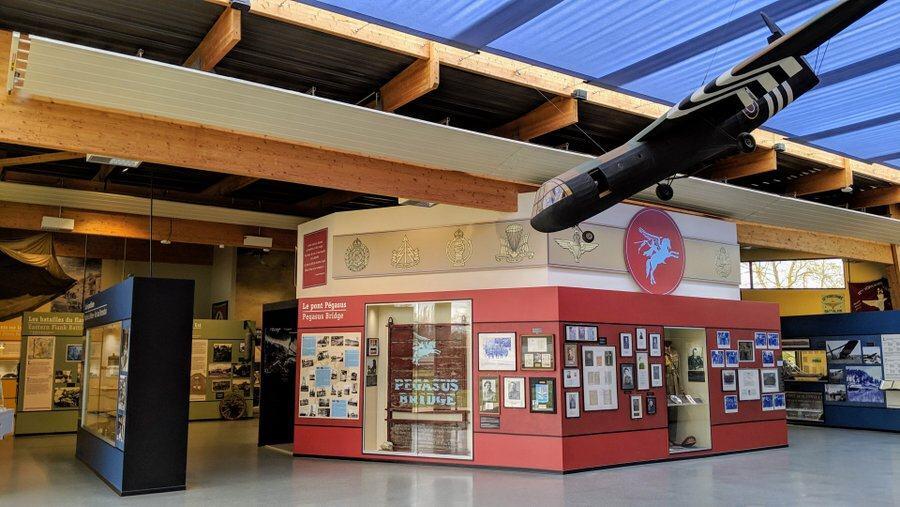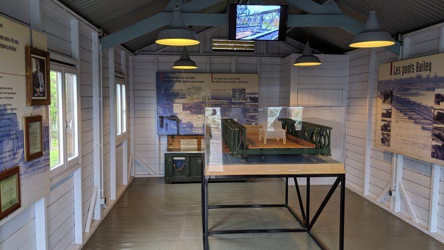 The museum is focused on this one particular action – the role of the 6th British Airborne (British and Canadians) on the eastern flank. It is located a few metres from the east end (island side) of the new Bénouville bridge. The new bridge looks very similar to the old bridge, which it replaced in 1994. The old bridge was sold to the museum association for 1 franc and now has pride of place in the museum grounds.