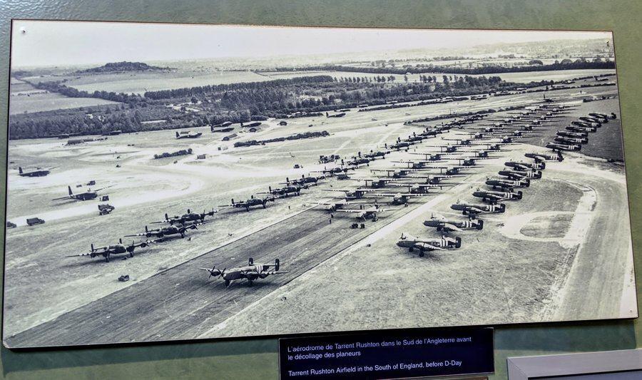 Take a look (above) at the B&W photos of the troops enjoying a cup of tea by their glider. Note the invasion stripes. The order to paint them was given at the very last minute – only 24hrs before D-Day in some cases. So they were applied hastily, usually with brooms, which explains the slightly ragged edges! Troop carriers were given a little more notice. They got the order to paint the stripes on 3rd June. So the photo of Terrent Rushton airfield must have been taken between 3rd and the evening of 5th June.
