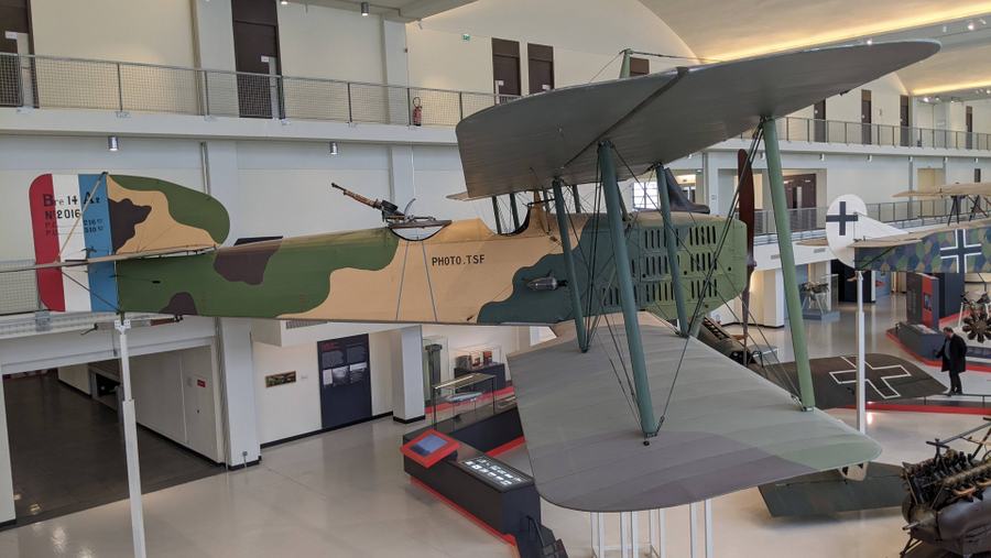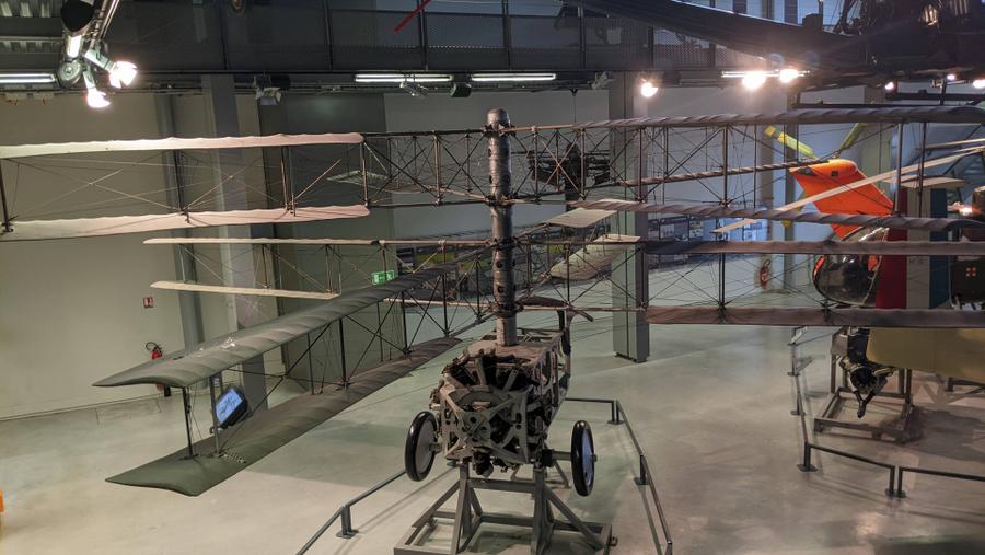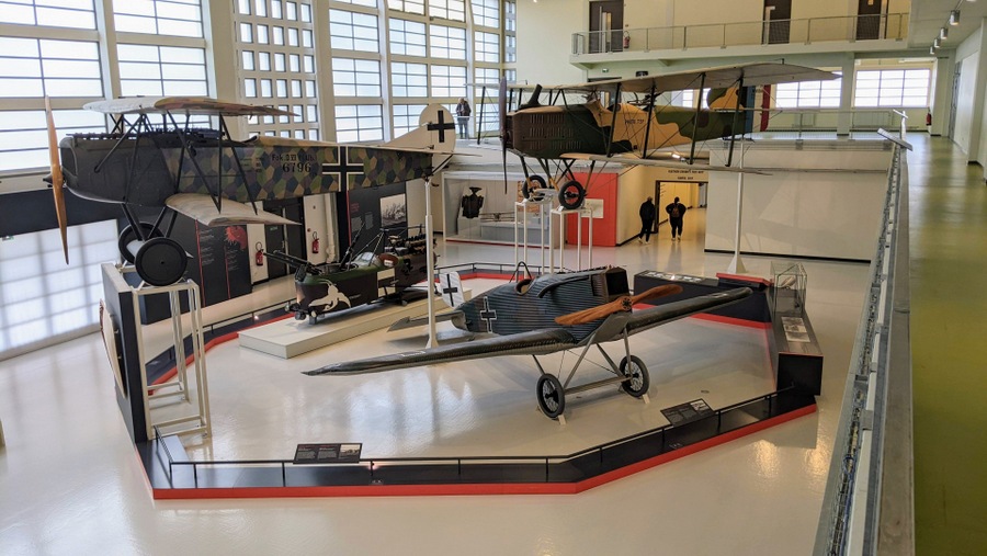 There’s a 1913 Maurice Farman MF.7 observation aircraft from the beginning of WW1, and a 1918 Fokker D.VII, the enemy fighter most respected by the Allies. In between, there’s a Breguet XIV bomber/reconnaissance aircraft, and a collection of WW1 engines.